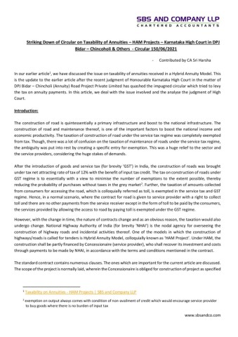 Striking Down of Circular – Taxability on Annuities – HAM Projects - GST - Contributed by CA Sri Harsha Sbs and Company LLP
